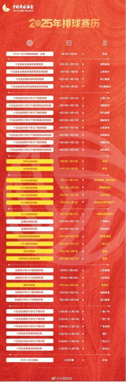 2025年排球赛历显示,中国女排赛季首秀定档,将是6月初至7月末举行的世界女排联赛。中国女排将于6月初在家门口北京参加第一周分站赛,对手依次是比利时女排、波兰女排、法国女排和土耳其女排。